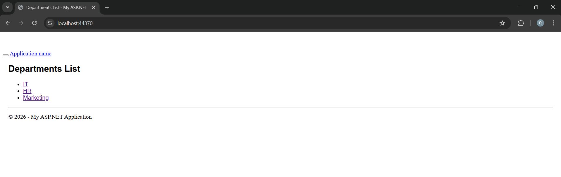 Index.cshtml@using Your_Project_Name; @model IEnumerable<Department> <div style="font-family:Arial"> @{ ViewBag.Title = "Departments List"; } <h2>Departments List</h2> <ul> @foreach (Department department in Model) { <li> @Html.ActionLink(department.Name,"Index","Employee",new { departmentId = department.Id },null) </li> } </ul> </div>
