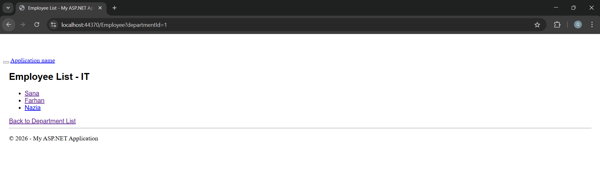 Index.cshtml@model IEnumerable<Your_Project_Name.Employee> <div style="font-family:Arial"> @{ ViewBag.Title = "Employee List"; } <h2> Employee List - @ViewBag.DepartmentName </h2> <ul> @foreach (Employee employee in Model) { <li> @Html.ActionLink(employee.Name,"Details",new { id = employee.EmployeeId }) </li> } </ul> @Html.ActionLink("Back to Department List","Index","Department") </div>