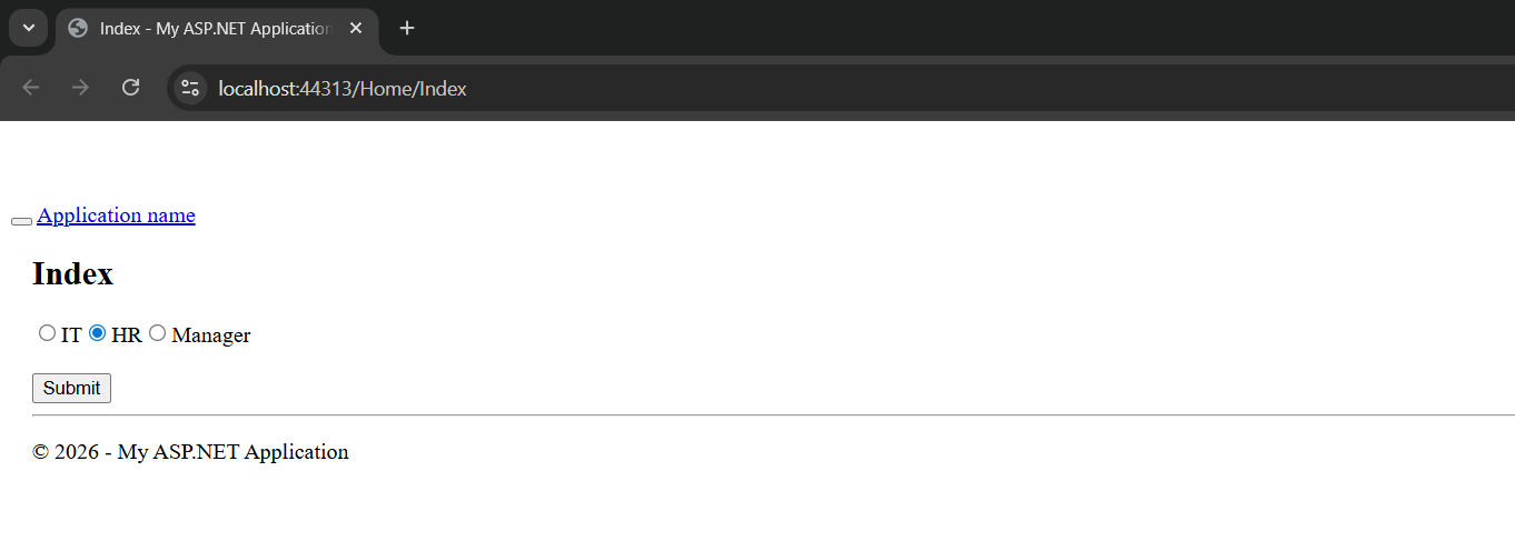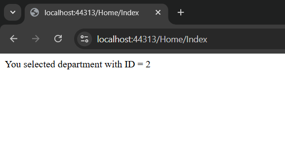 using System; using System.Collections.Generic; using System.Linq; using System.Web; using System.Web.Mvc; using Your_Project_Name.Models; namespace Your_Project_Name.Controllers { public class HomeController : Controller { [HttpGet] public ActionResult Index() { Company company = new Company(); return View(company); } [HttpPost] public string Index(Company company) { if (string.IsNullOrEmpty(company.SelectedDepartment)) { return "You did not select any department"; } else { return "You selected department with ID = " + company.SelectedDepartment; } } } }