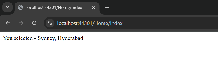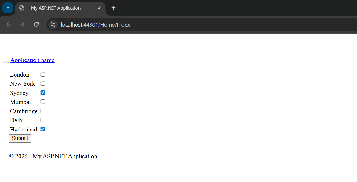 using System; using System.Collections.Generic; using System.Linq; using System.Text; using System.Web; using System.Web.Mvc; namespace Your_Project_Name.Controllers { public class HomeController : Controller { [HttpGet] public ActionResult Index() { MVC_CheckboxDBEntities dbContext = new MVC_CheckboxDBEntities(); return View(dbContext.Cities.ToList()); } [HttpPost] public string Index(IEnumerable<City> cities) { if (cities.Count(x => x.IsSelected) == 0) { return "You have not selected any City"; } else { StringBuilder sb = new StringBuilder(); sb.Append("You selected - "); foreach (City city in cities) { if (city.IsSelected) { sb.Append(city.City_Name + ", "); } } sb.Remove(sb.ToString().LastIndexOf(","), 1); return sb.ToString(); } } } }