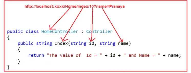 using System; using System.Collections.Generic; using System.Linq; using System.Web; using System.Web.Mvc; namespace Your_Web_Application_Name.Controllers { public class HomeController : Controller { // GET: Home public string Index (string id,string name) { return "The value of Id = " + id + " and Name = " + name; } } }